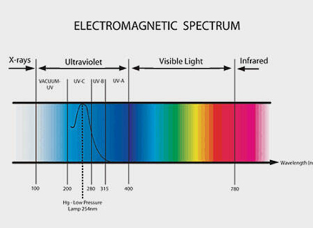 La energía de la luz ultravioleta, es radiación electromagnética que viaja en forma de ondas. La radiación ultravioleta (UV) se encuentra en el espectro electromagnético después de la franja de rayos X y antes de la franja infraroja. La franja UV va desde 100 hasta 400 nm. ( 1 nm = 1 / 1000 micra ). La energía empleada para el tratamiento UV de aguas se clasifican además en dos grupos principales : las longitudes de onda de 254nm y las de 185 nm. Para aplicaciones de desinfección y destrucción de ozono, la longitud de onda 254 nm. es la adecuada; para TOC ( Reducción de Carbón Orgánico Total ) y eliminación de Cloro y cloraminas la adecuada es la de 185 nm. Para desinfección la energía UV penetra la membrana del micro-organismo, llega al núcleo y altera el ADN (ácido desoxirribonucleico - material genético ) por lo que ya no hay reproducción y por ende no habrá infección en la ingesta humana. La dósis de radiación debe cubrir 2 aspectos: un nivel de desinfección de 3 Log y al final de la vida útil de las lámparas, 30,000 Watts - seg / cm. La desinfección no es química y por ende la UV no imparte: sabores, olores, colores, ni cambia el pH. El Carbón Orgánico Total se forma por restos de micro-organismos y son moléculas con : Carbón - Fluor - Nitrógeno - Azufre - Hidrógeno. La logitud de onda de 185 nm., rompe dichas moléculas formando hidroxilos que a su vez se descomponen en agua y gas carbónico.